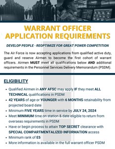 April 25, 2024 Air Force to begin accepting warrant officer applications The Air Force is now accepting applications for Airmen aspiring to become the inaugural cohort of warrant officers in the information technology and cyber career fields.
