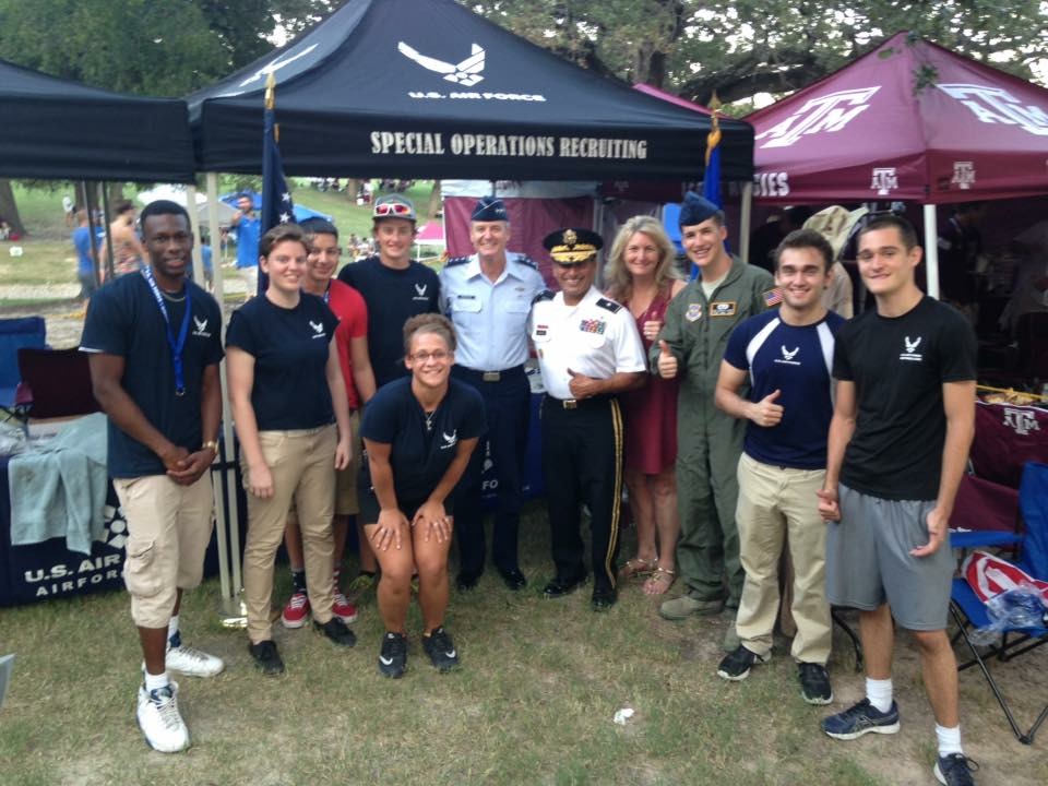 Staff Sgt. Justin Casey and Members of the 341st Delayed Entry Program pose with Lt. Gen. Darryl Roberson, Air Education and Training Command commander, his wife Cheryl, and Retired Brig. Gen. Joe Ramirez, Texas A&M Corps of Cadets commandant, at the Texas A&M football game in College Station, Texas, Sept. 3. Casey was able to set up a display across the street from the stadium and engage with the fans as they tailgated and entered the game that had a crowd of over 100,000 people.