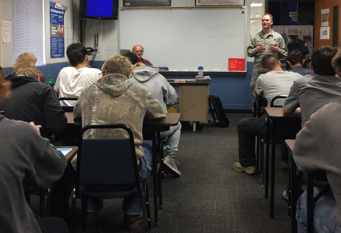 Staff Sgt. Victor Blazevic, 339th Recruiting Squadron enlisted accessions recruiter out of Merrillville, Ind., gives a presentation to students at Porter County Career Center in Valporaiso, Ind., Nov. 9. The presentation, given to an automotive technology class, provided information about mechanical opportunities and benefits of the Air Force.