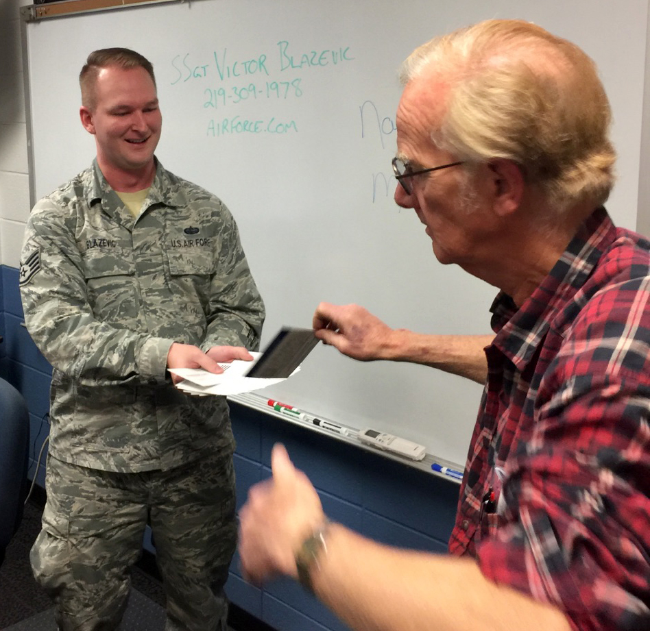 Staff Sgt. Victor Blazevic, 339th Recruiting Squadron enlisted accessions recruiter helps Karl Sickels, a teacher at Porter County Career Center in Valporaiso, Ind., draw the winner of an Air Force backpack at the end of Blazevic's presentation.